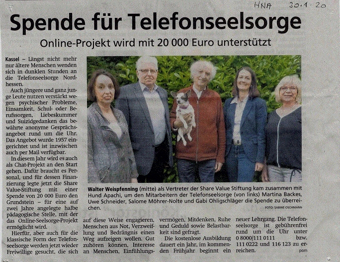 In diesem Jahr wird es auch als Chat-Projekt an den Start gehen. Dafür braucht es Personal, und für dessen Finanzierung legte jetzt die Share Value Stiftung mit einer Spende von 20 000 Euro den Grundstein – für eine auf zwei Jahre angelegte halbe pädagogische Stelle, mit der das Online-Seelsorge-Projekt ermöglicht wird.